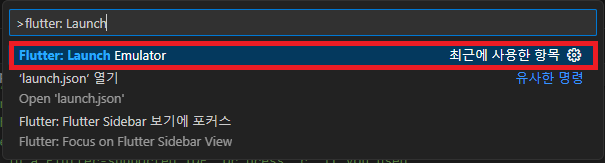 [Ctrl+Shift+p]를 눌러서 팔렛트를 실행한 뒤 "Flutter: Launch Emulator"를 선택한다.