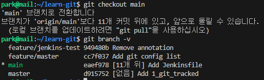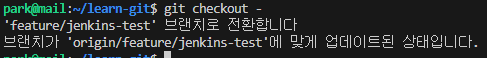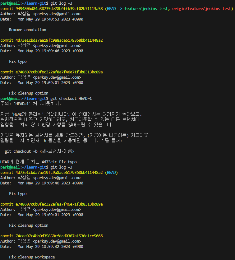 git checkout HEAD~1 # 2개 이전은 HEAD~2 식으로 숫자만 바꾸면 됨