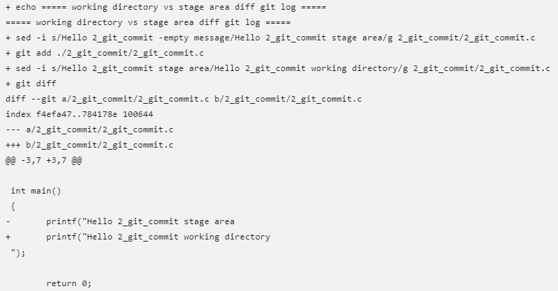 1. printf("Hello 2_git_commit stage area");로 수정하고 git add를 함.